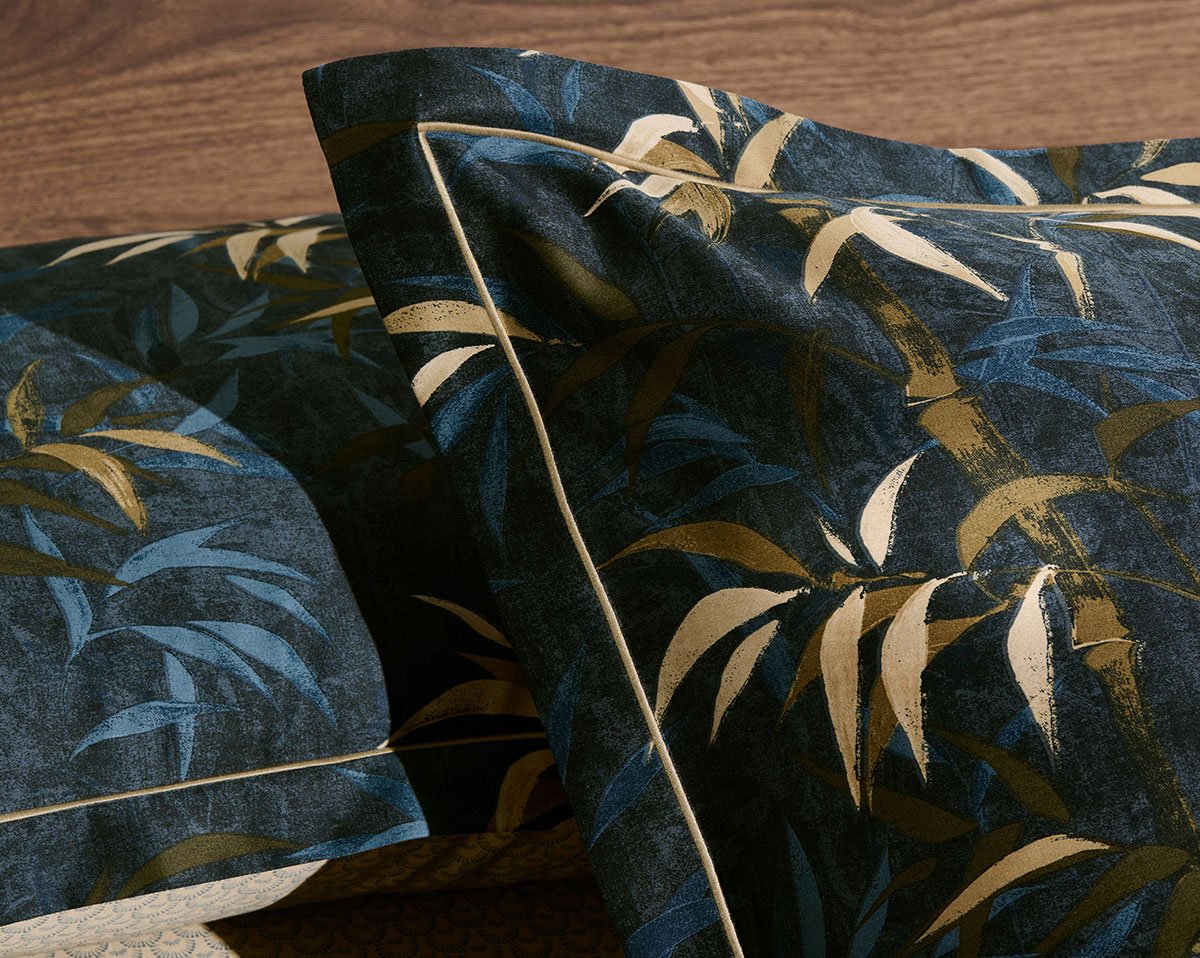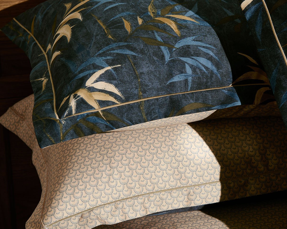 Atmosphère nocturne et méditative où la végétation offre un jeu subtil d’ombres et de lumières. Un motif palmettes bleu nuit sur fond beige doré complète ce modèle végétal et lui confirme son identité ultra décorative.