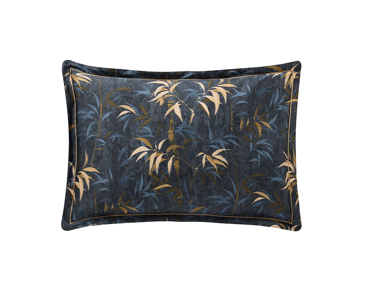 L'envolée légère des feuilles de bambou dans des teintes nocturnes et dorées sur le recto s’harmonise aux palmettes du verso.